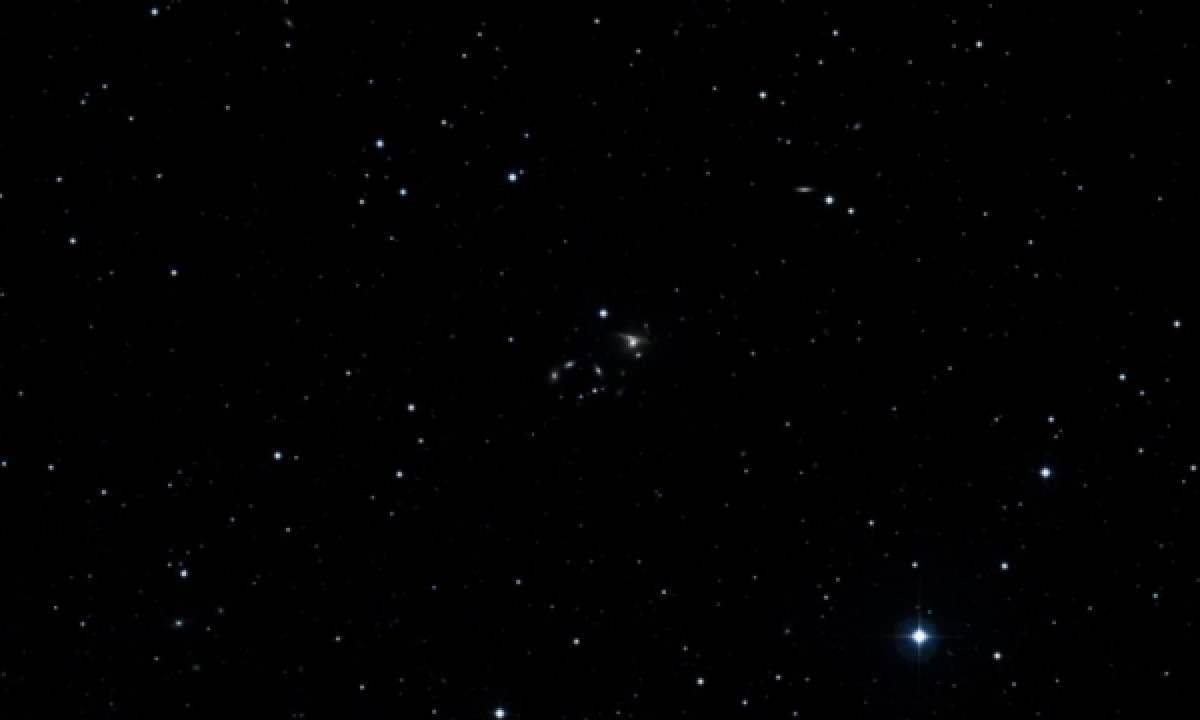 From South El Monte , Hickson 75 is visible in the morning sky, becoming accessible around 23:16, when it reaches an altitude of 21° above your eastern horizon. It will then reach its highest point in the sky at 04:24, 77° above your southern horizon. It will be lost to dawn twilight around 05:15, 72° above your south-western horizon.