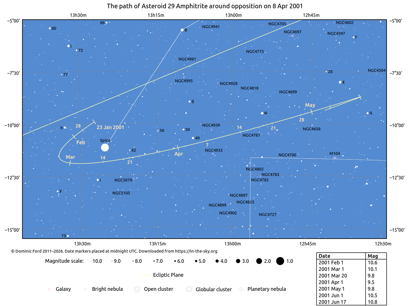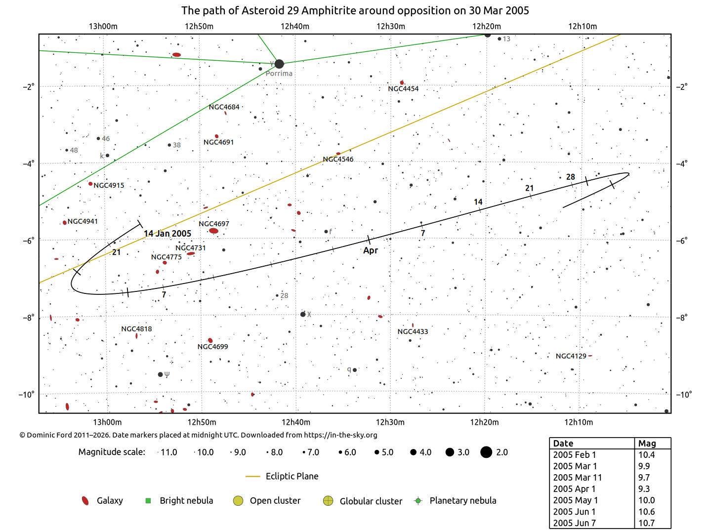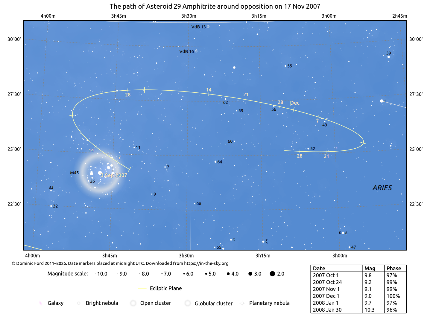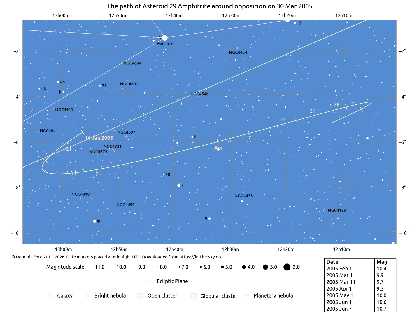 The positions of asteroids are calculated from orbital elements published by Ted Bowell of the Lowell Observatory. Comet positions are computed from orbital elements published by the Minor Planet Center (MPC).