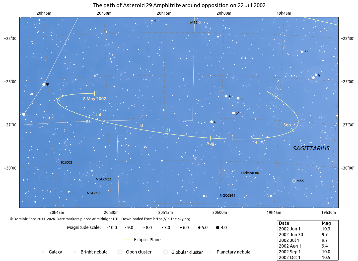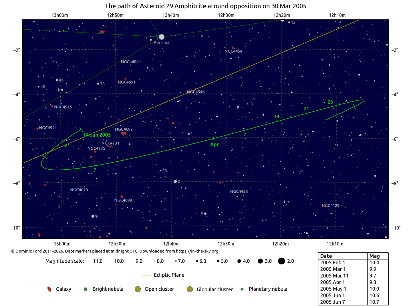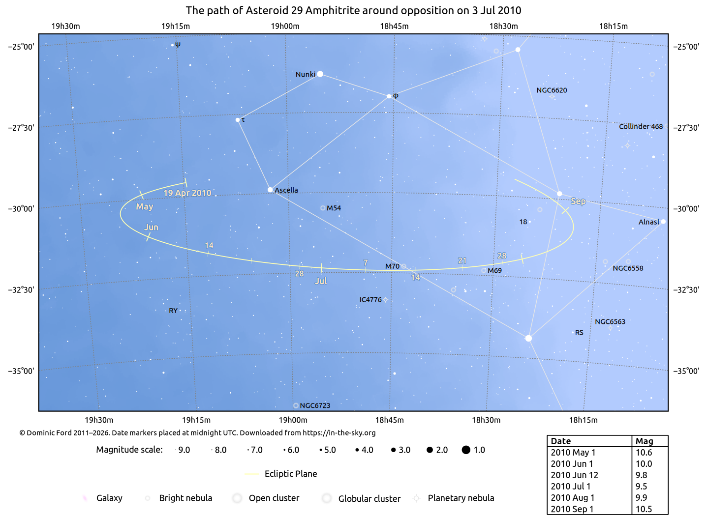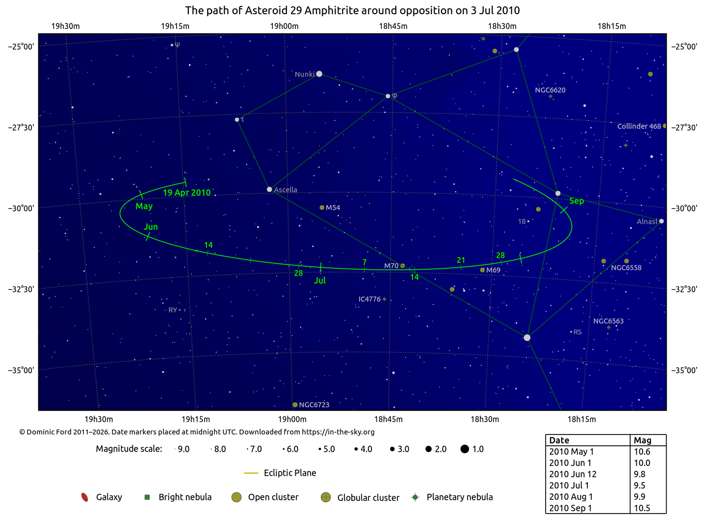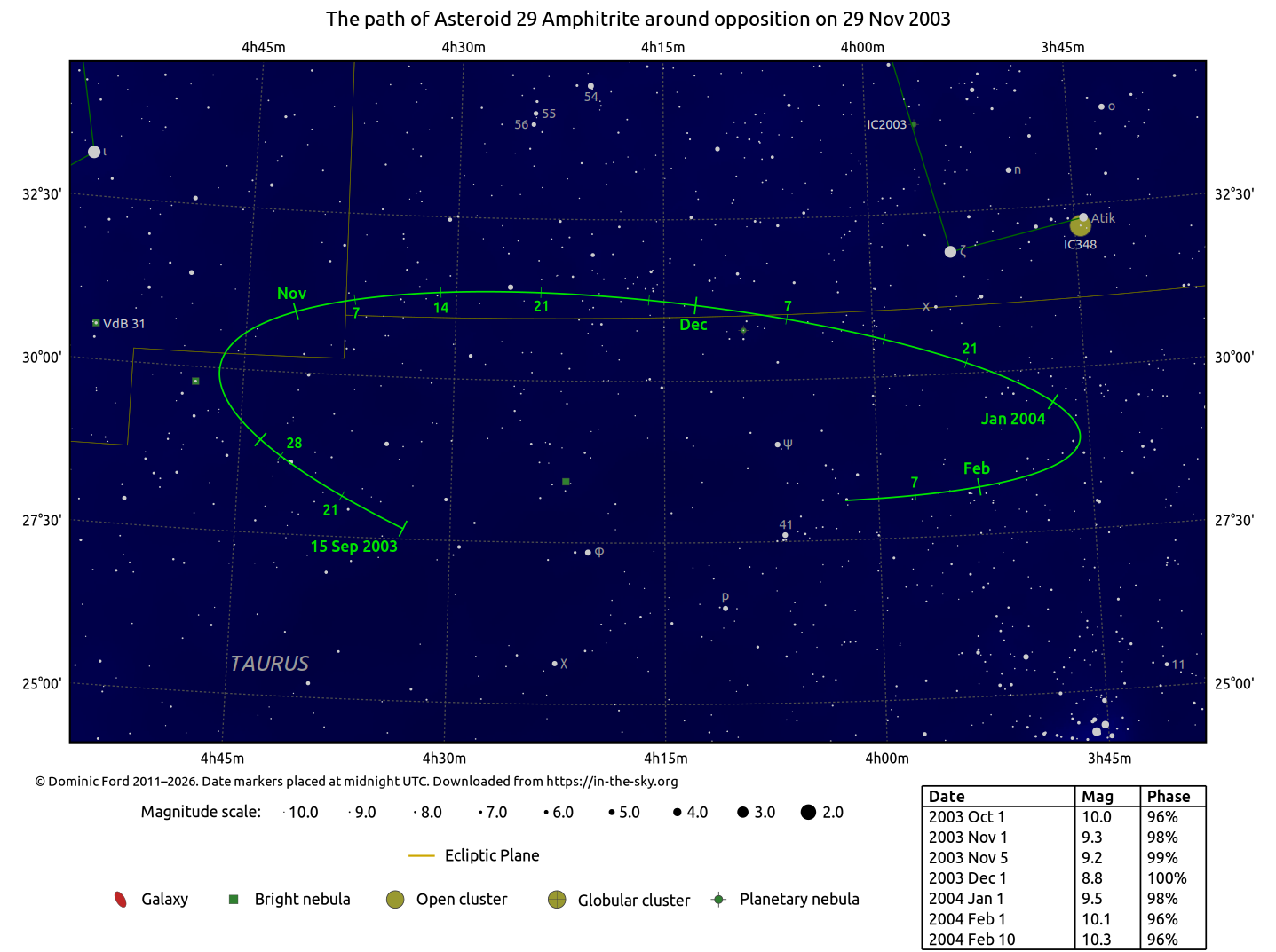 The positions of asteroids are calculated from orbital elements published by Ted Bowell of the Lowell Observatory. Comet positions are computed from orbital elements published by the Minor Planet Center (MPC).