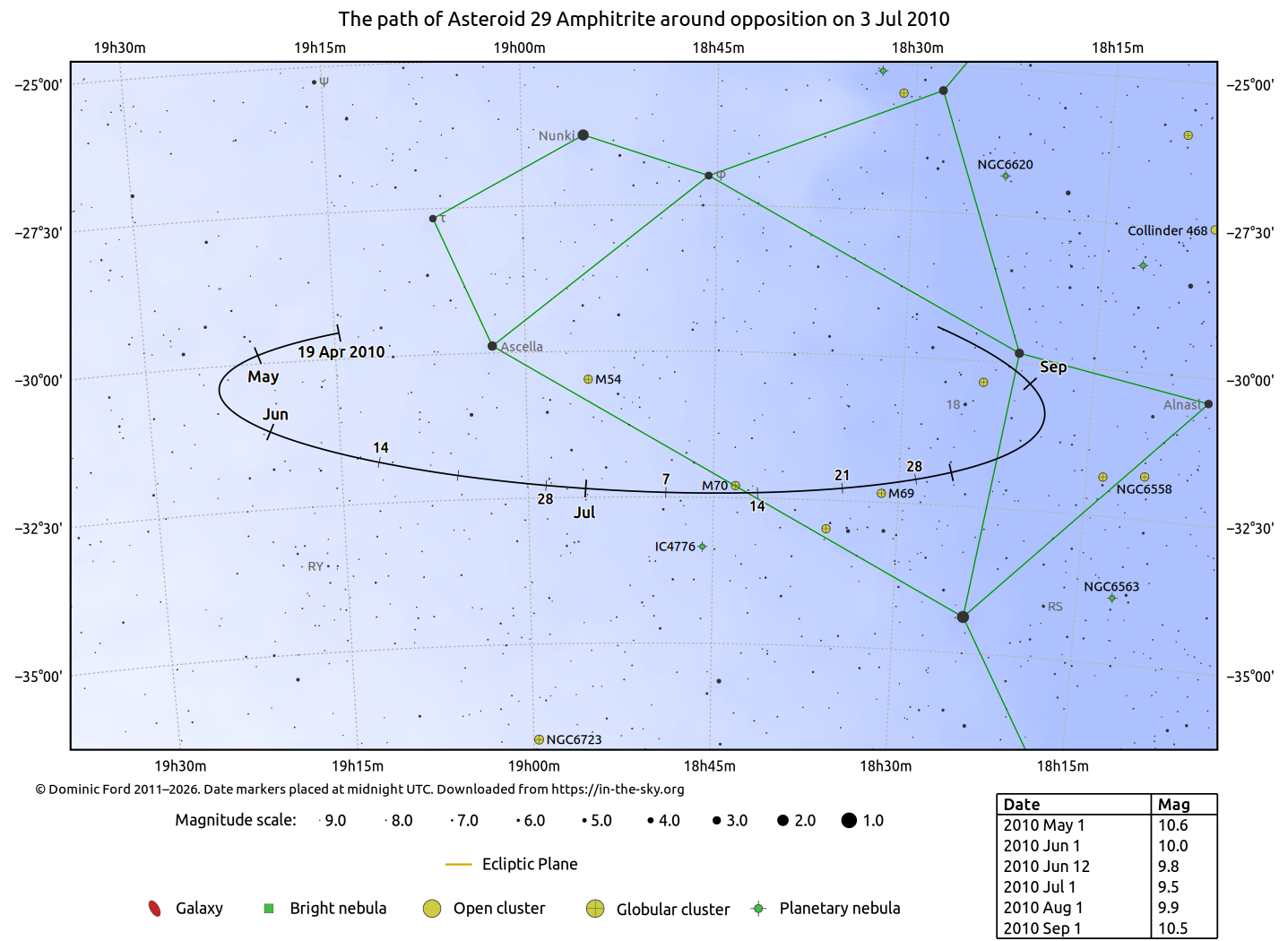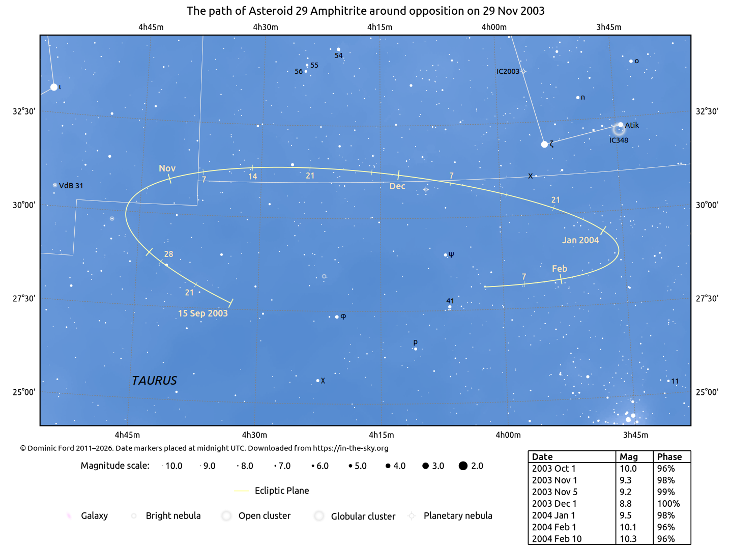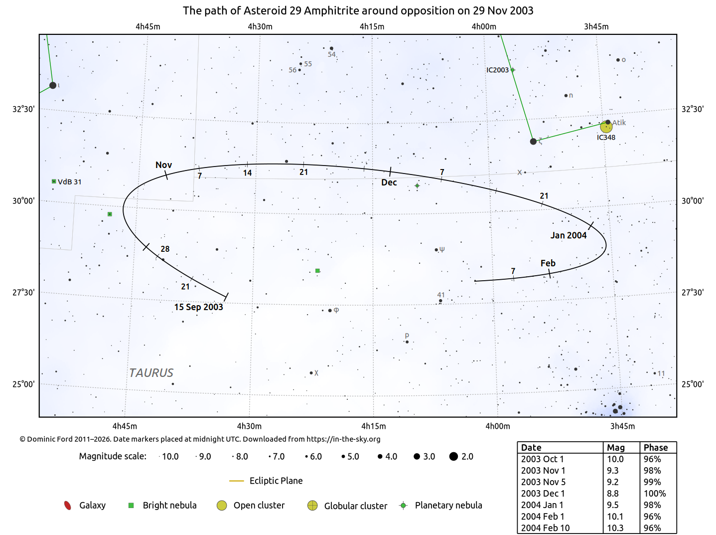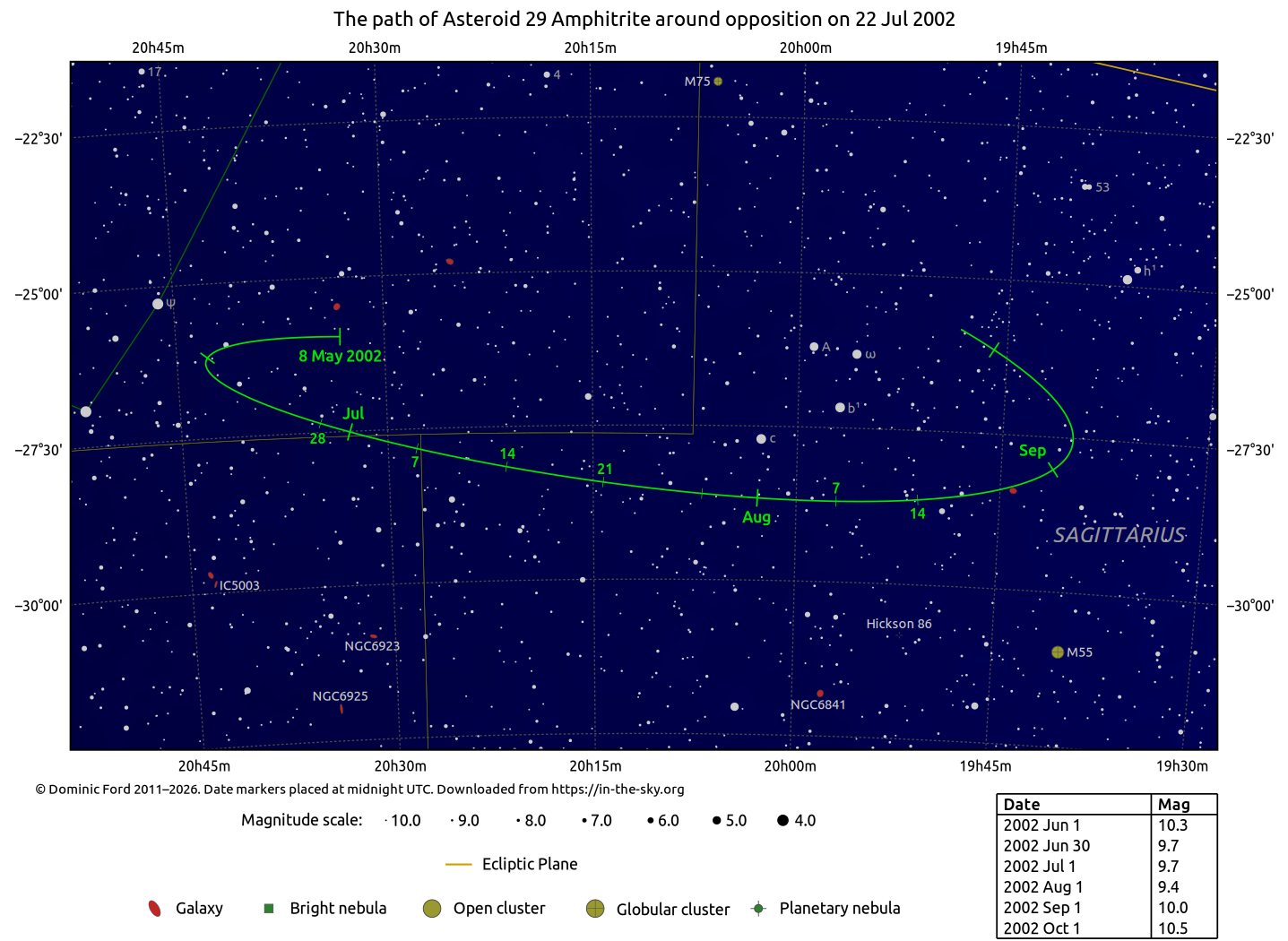 The positions of asteroids are calculated from orbital elements published by Ted Bowell of the Lowell Observatory. Comet positions are computed from orbital elements published by the Minor Planet Center (MPC).