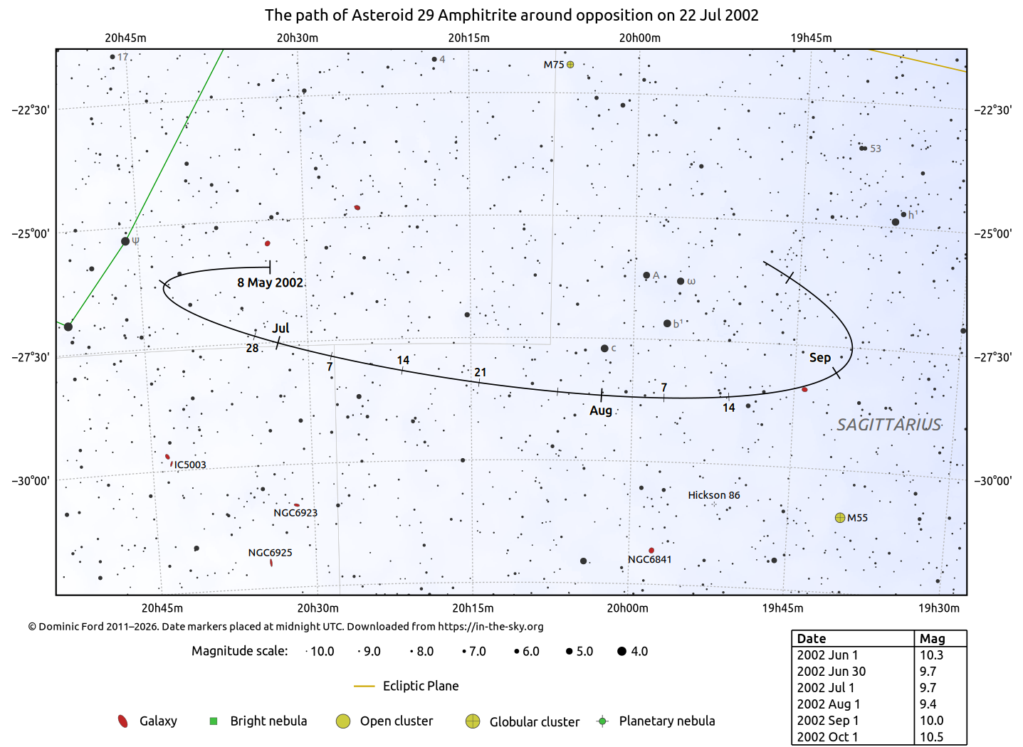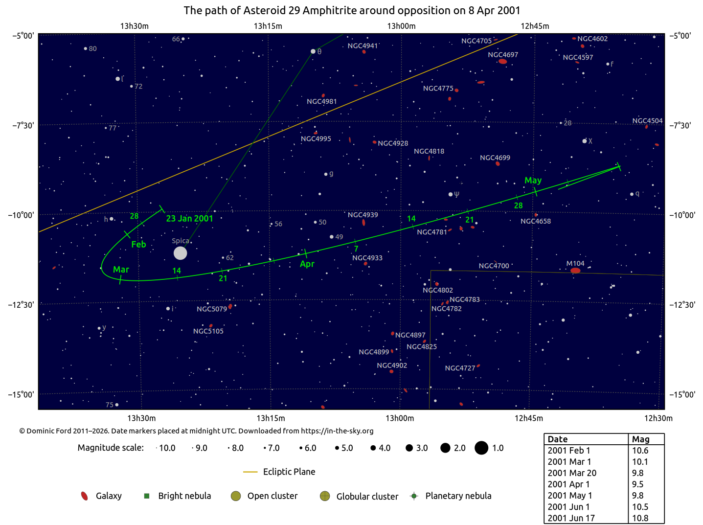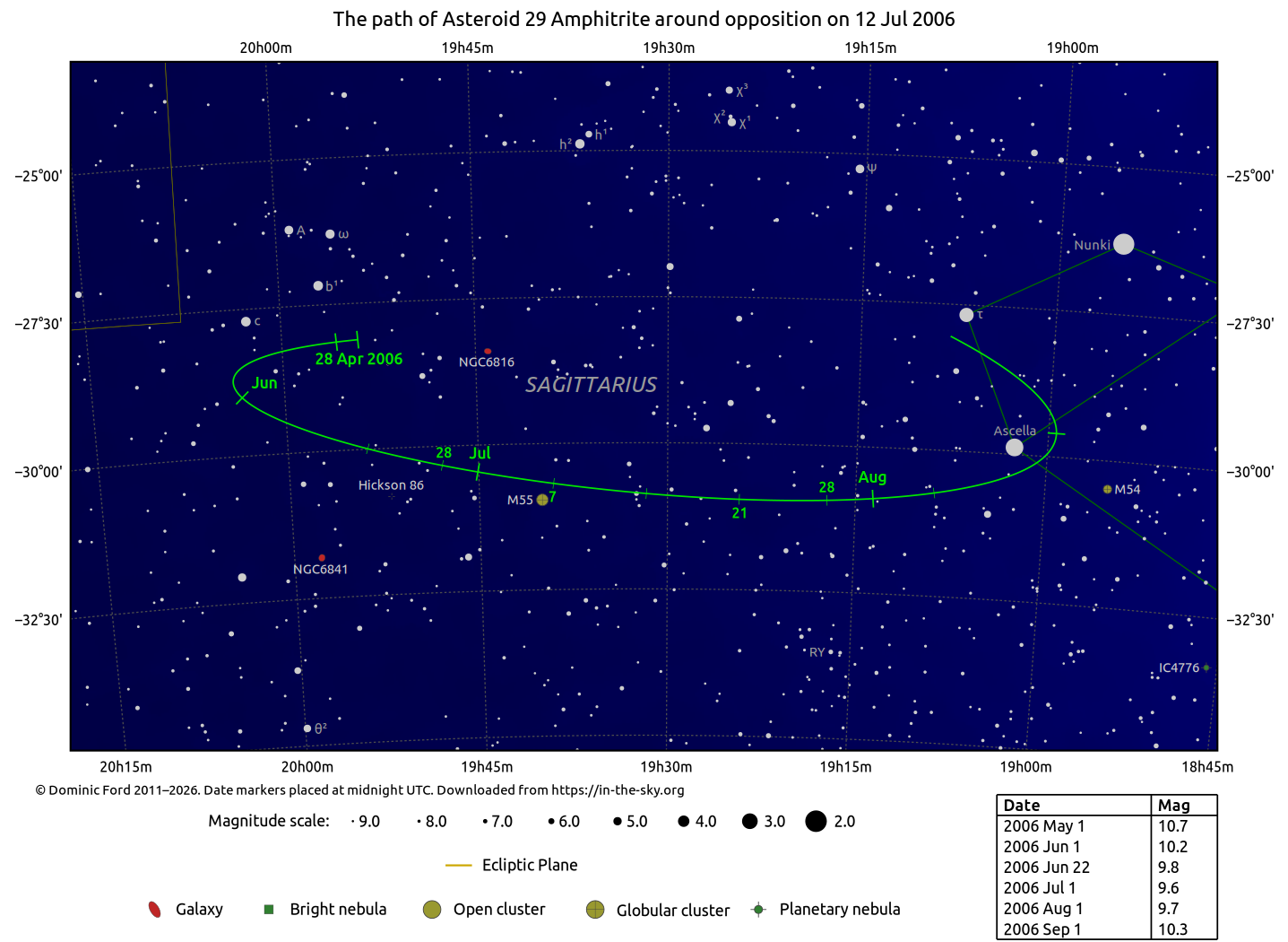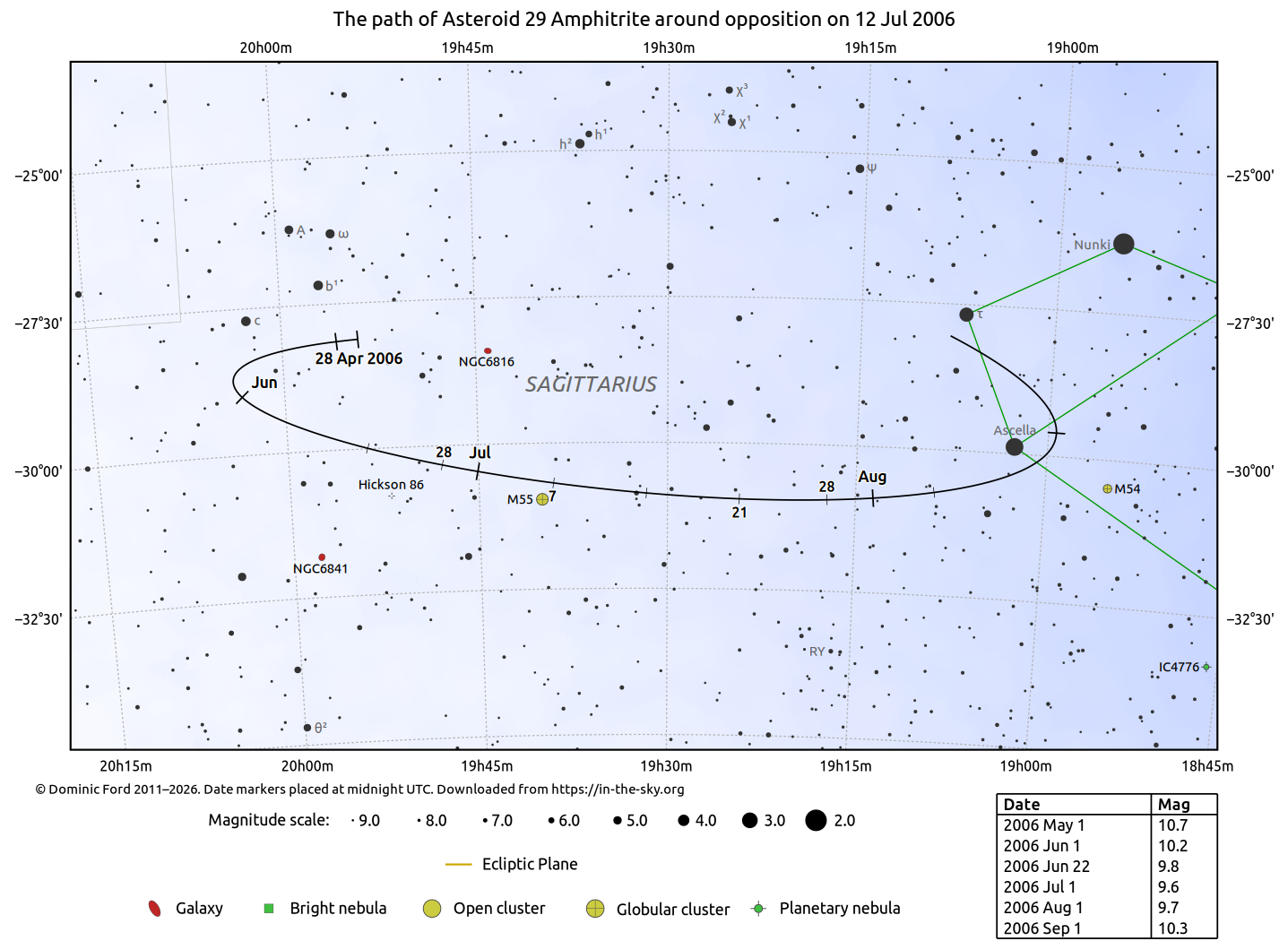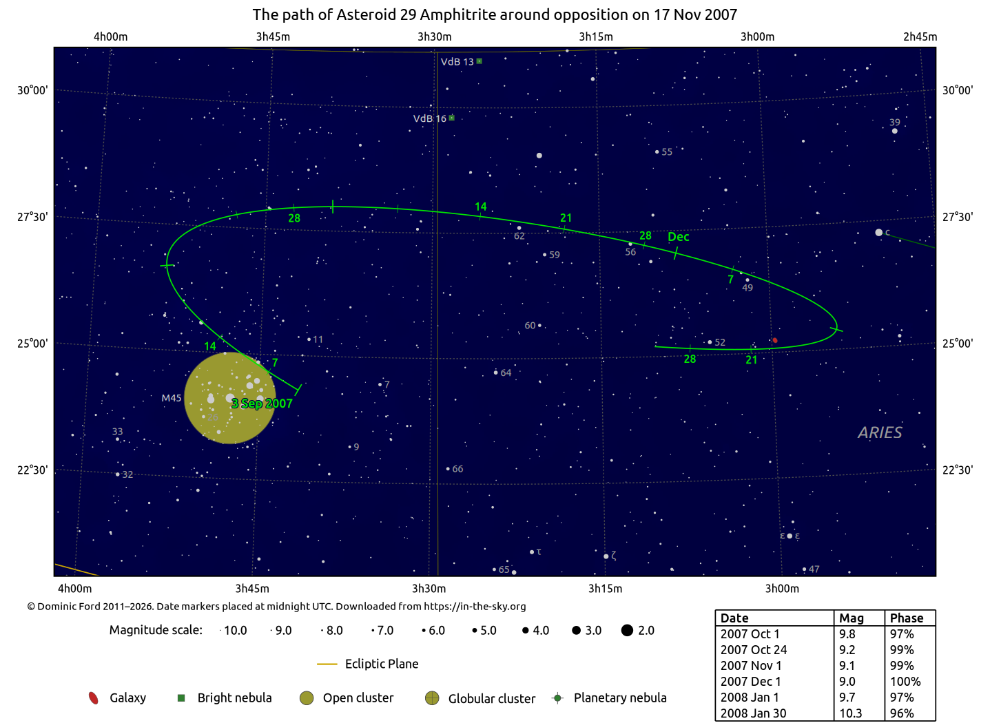 The positions of asteroids are calculated from orbital elements published by Ted Bowell of the Lowell Observatory. Comet positions are computed from orbital elements published by the Minor Planet Center (MPC).