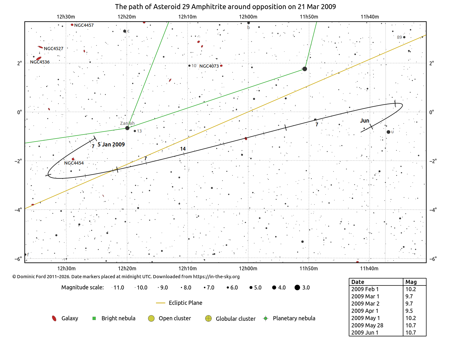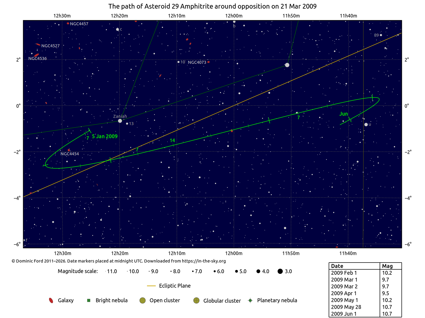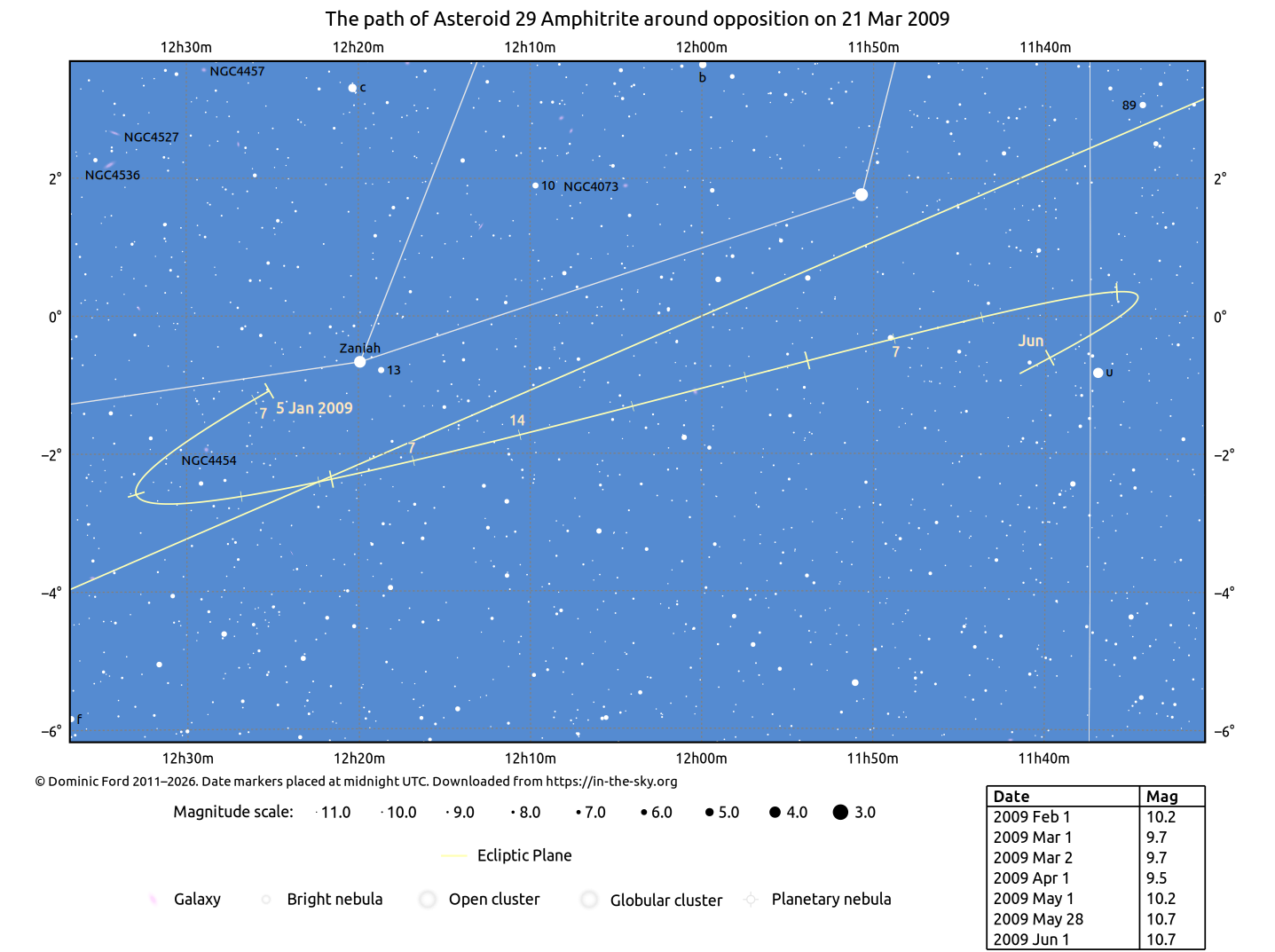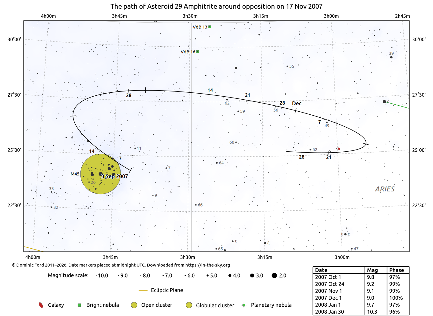 The positions of asteroids are calculated from orbital elements published by Ted Bowell of the Lowell Observatory. Comet positions are computed from orbital elements published by the Minor Planet Center (MPC).