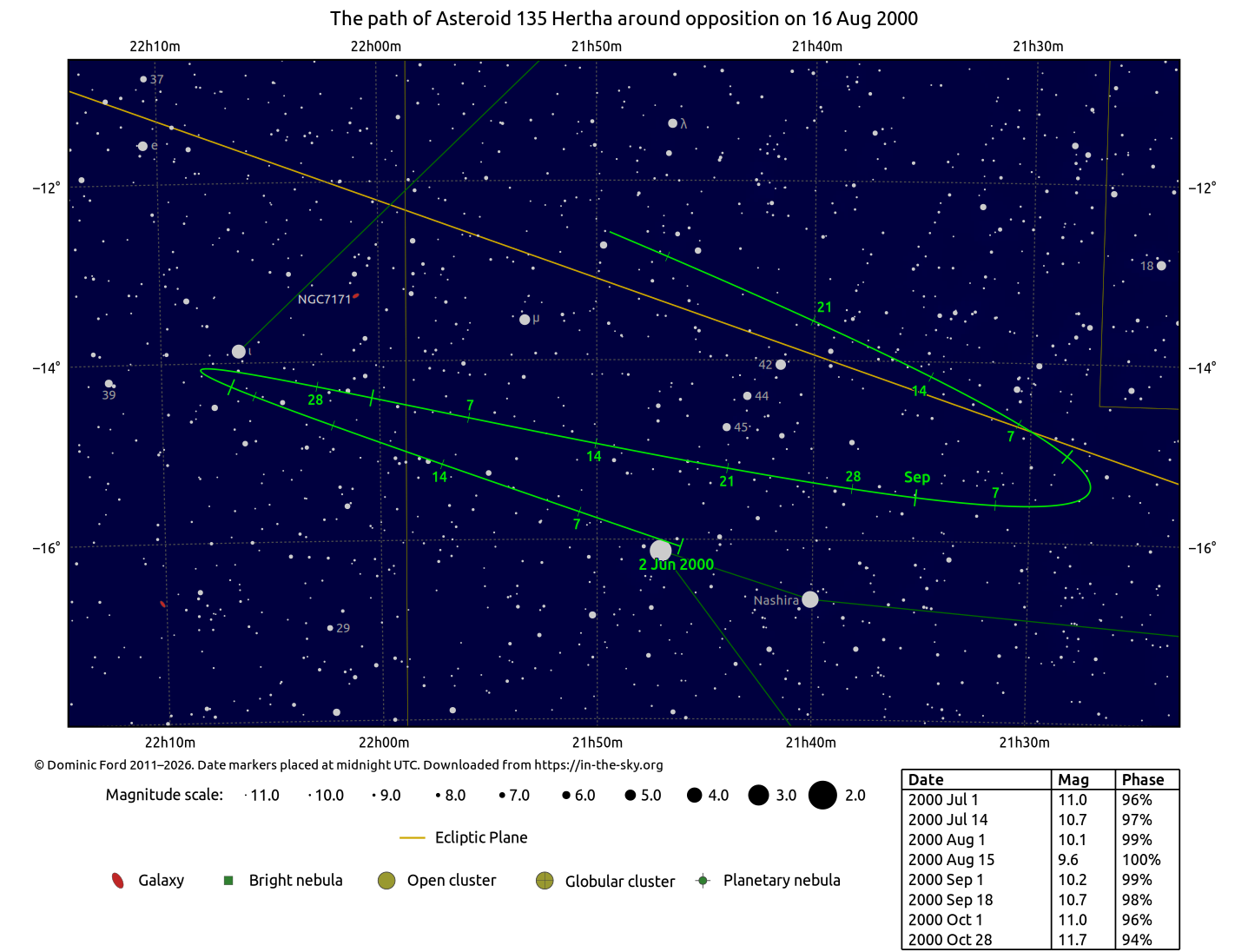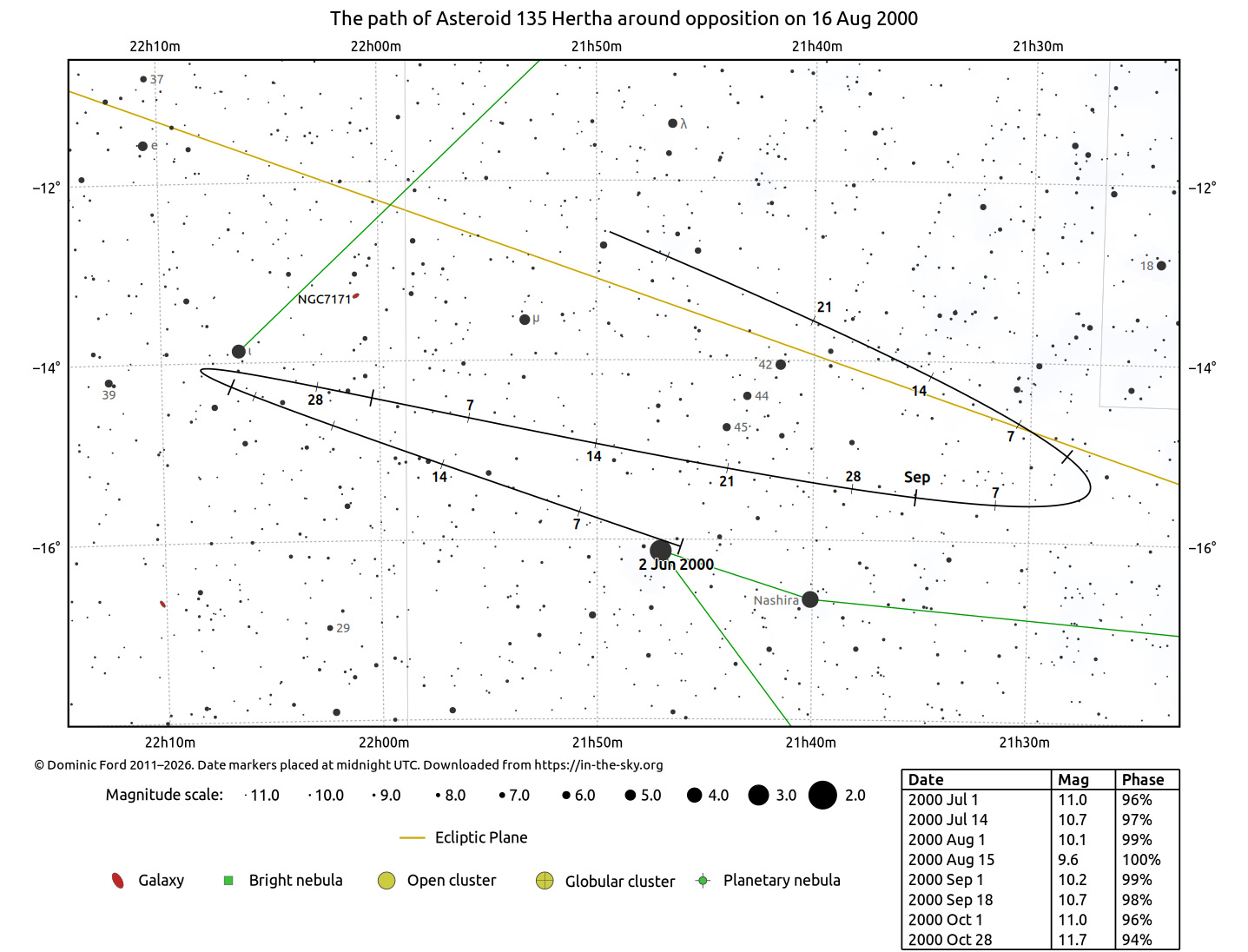 The chart below indicates the path of 135 Hertha across the sky around the time of opposition.