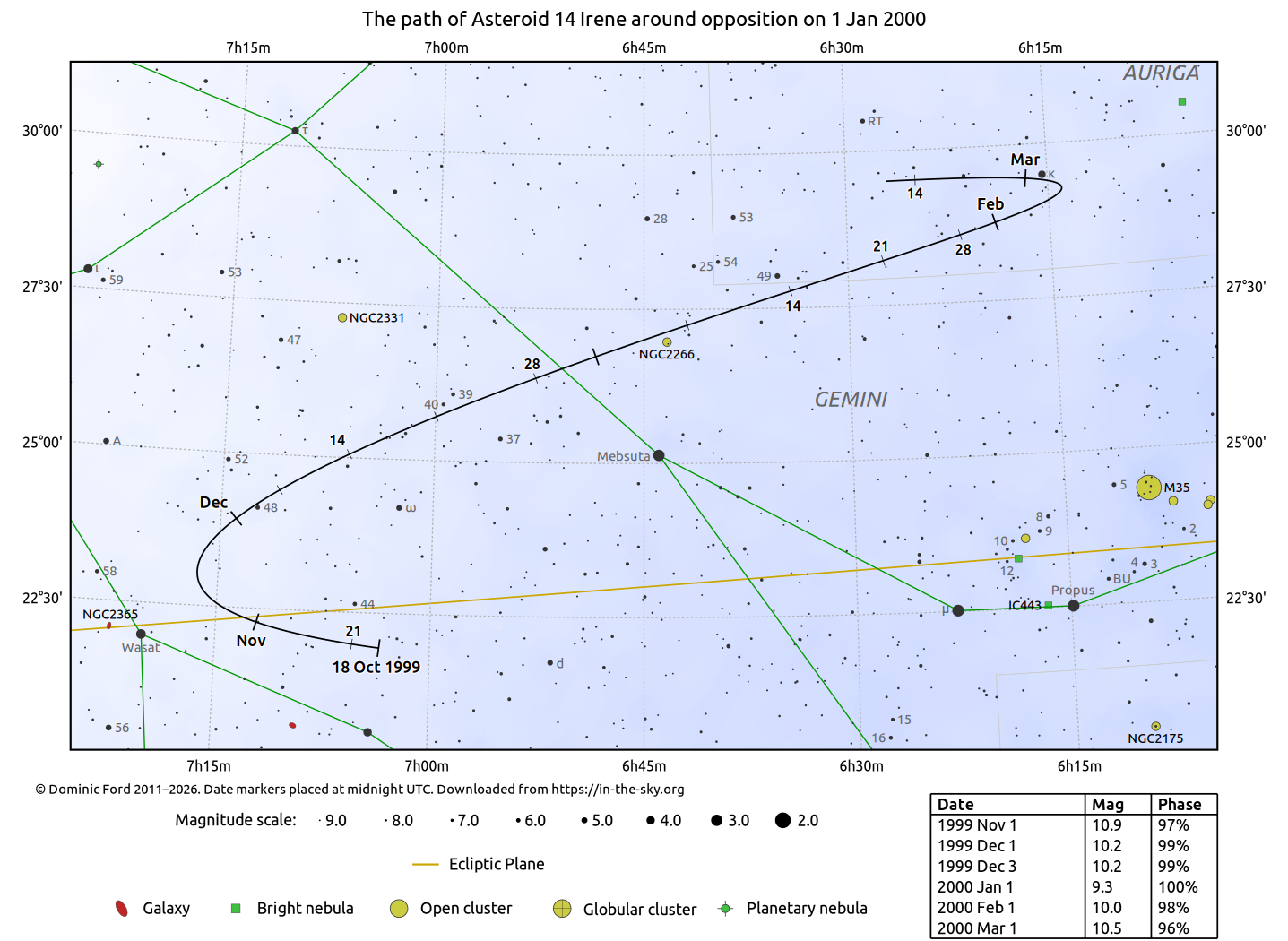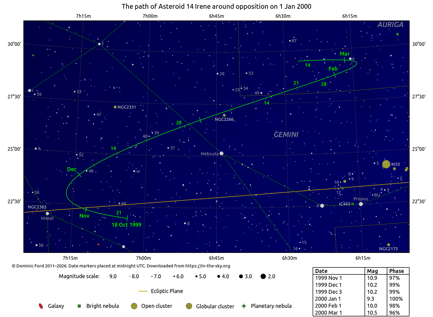 The chart below indicates the path of 14 Irene across the sky around the time of opposition.