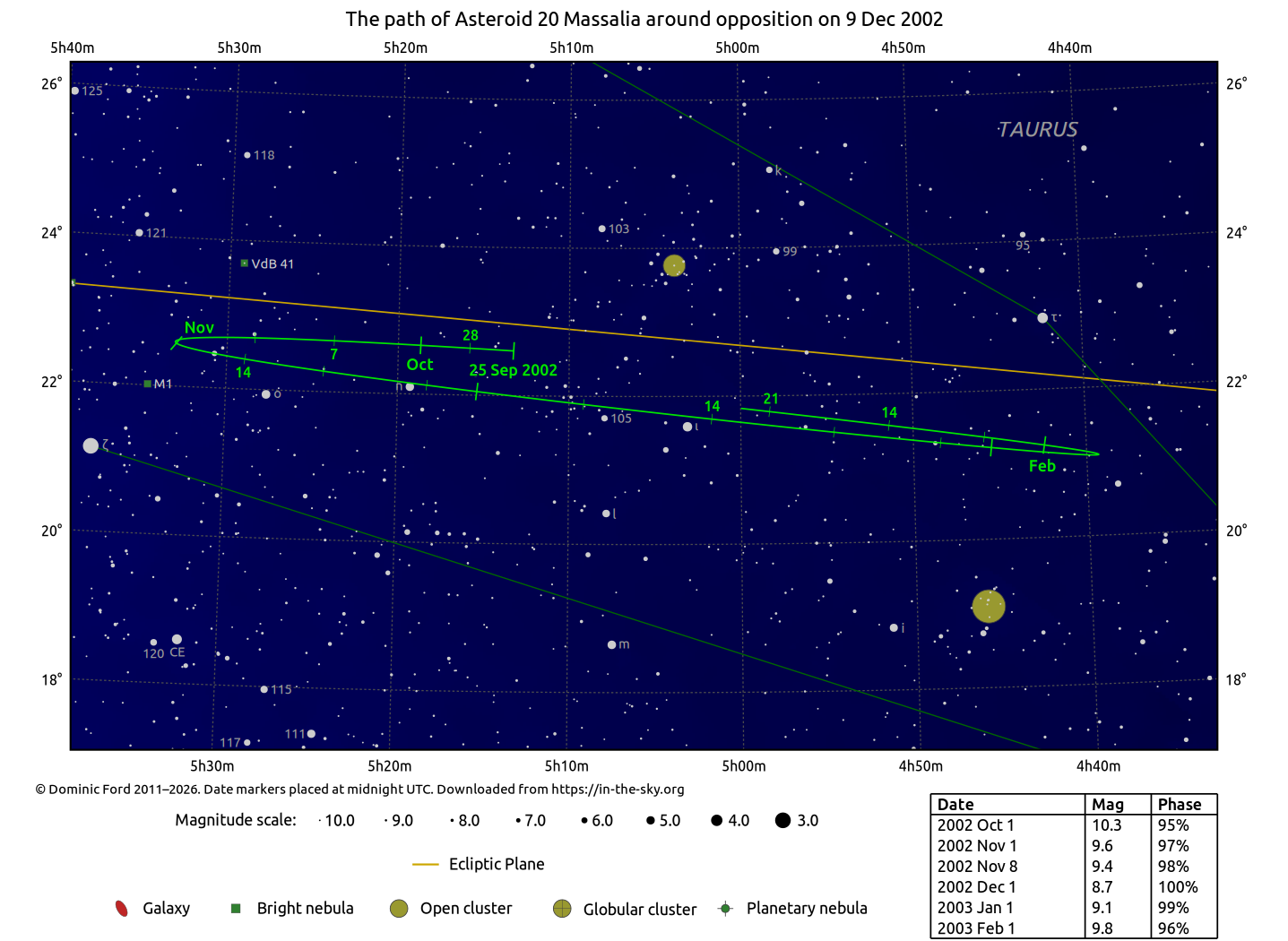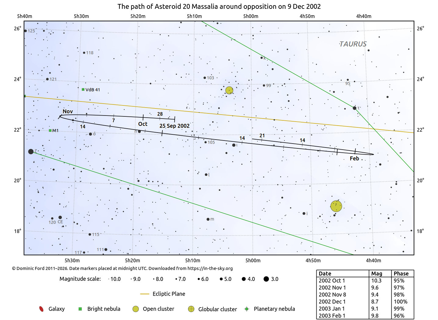 The chart below indicates the path of 20 Massalia across the sky around the time of opposition.
