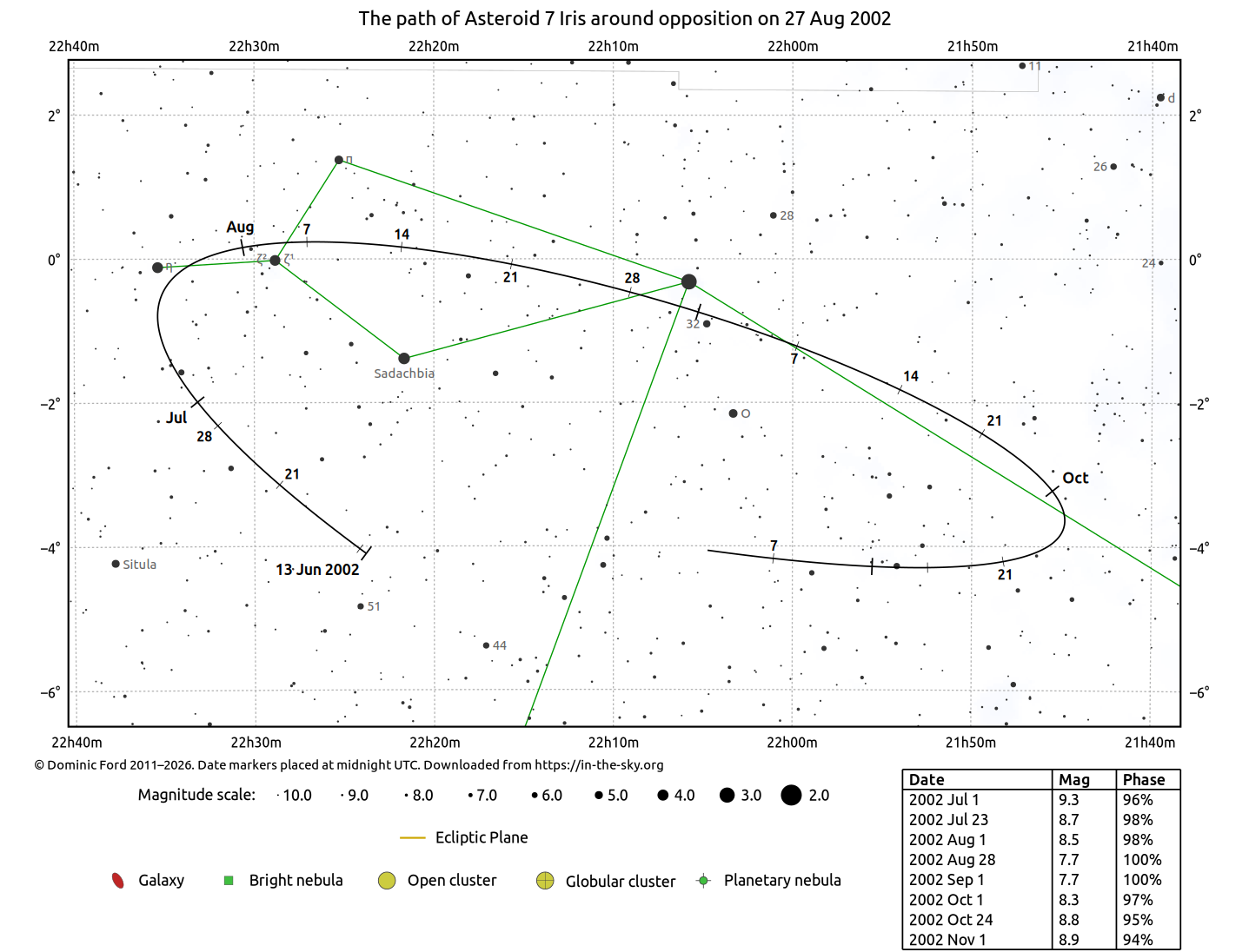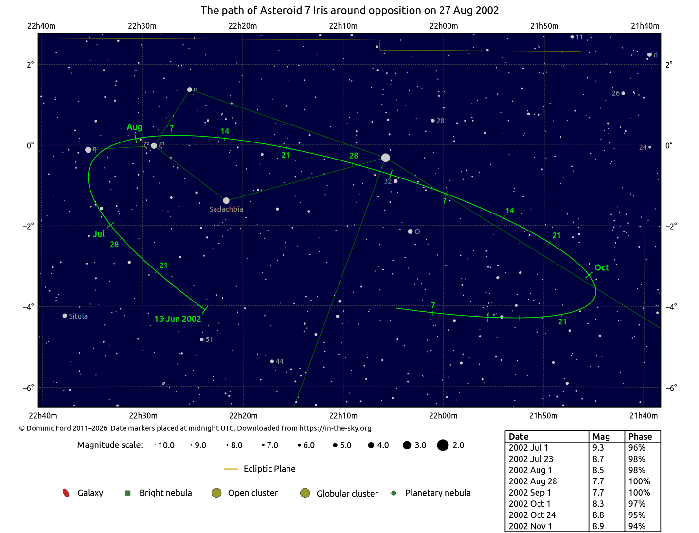 The chart below indicates the path of 7 Iris across the sky around the time of opposition.