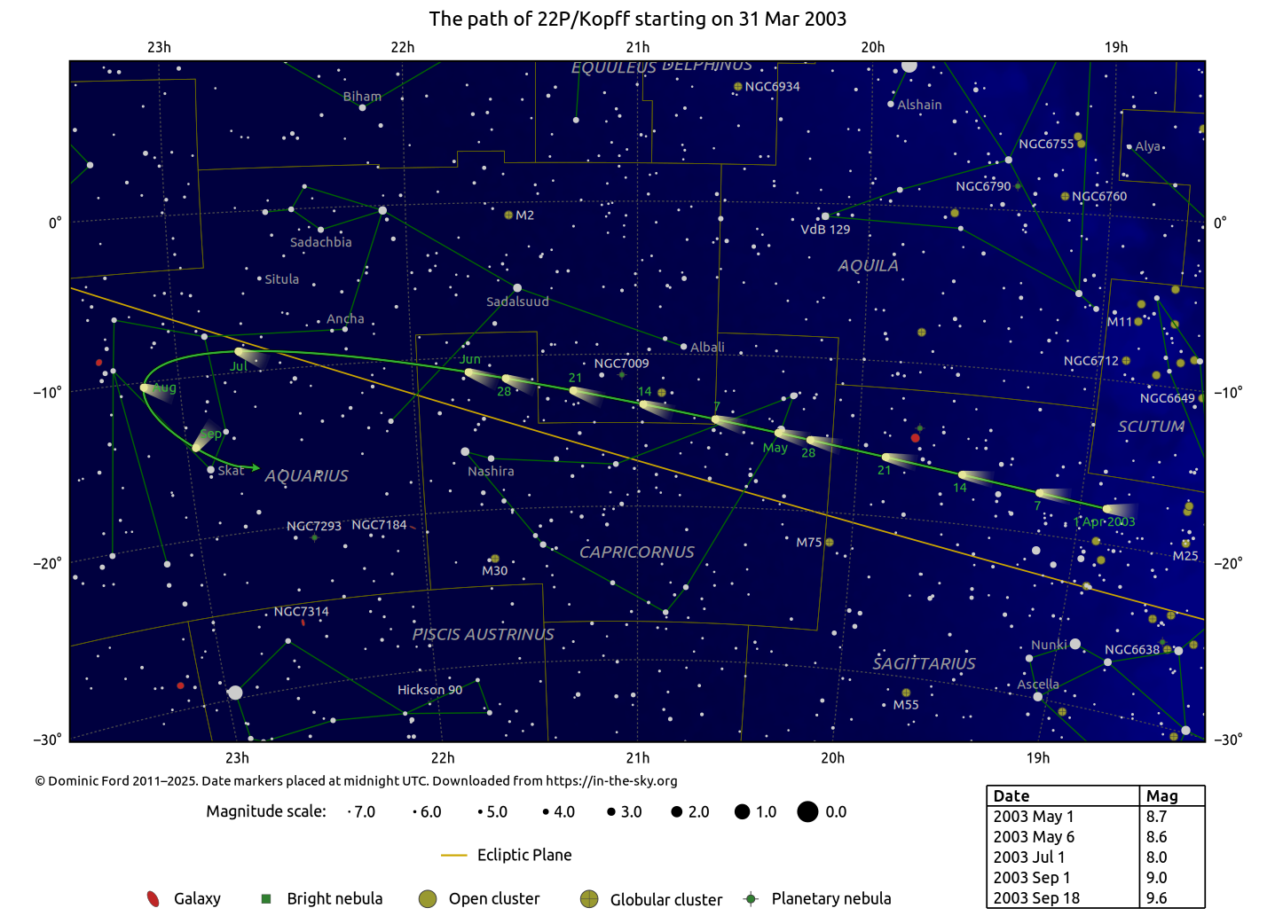 Comet 22P/Kopff | 21h45m50s | 10°57'S | Capricornus | 8.2 |