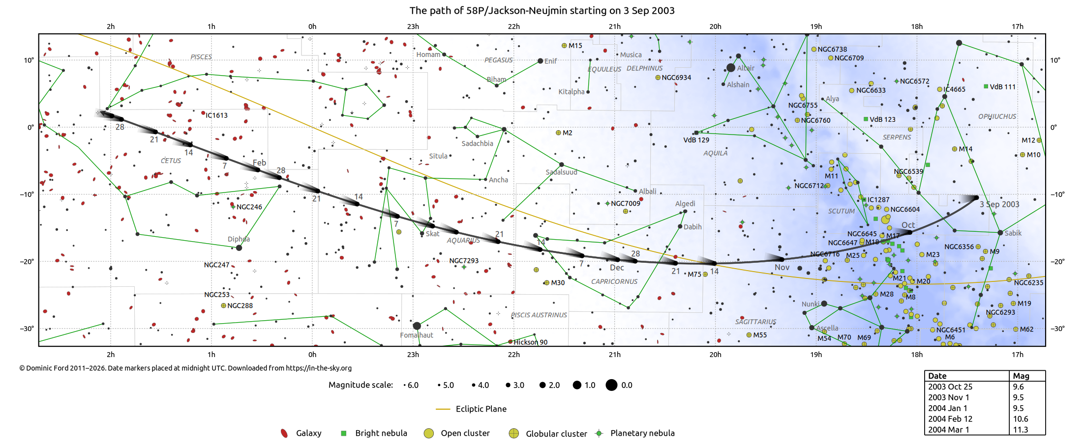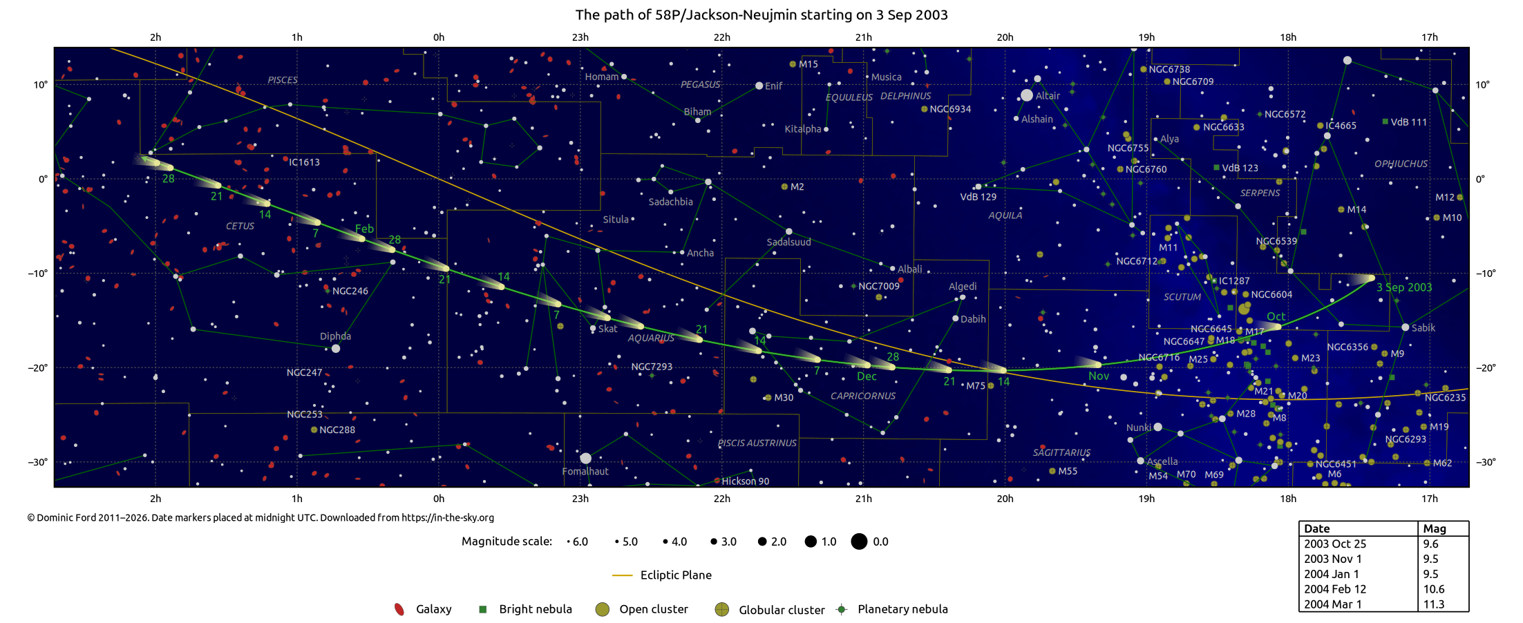 The chart below shows the path of 58P/Jackson-Neujmin over the course of its apparition, as calculated from the orbital elements published by the Minor Planet Center (MPC). It is available for download, either on dark background, in PNG, PDF or SVG formats, or on a light background, in PNG, PDF or SVG formats. It was produced using StarCharter.