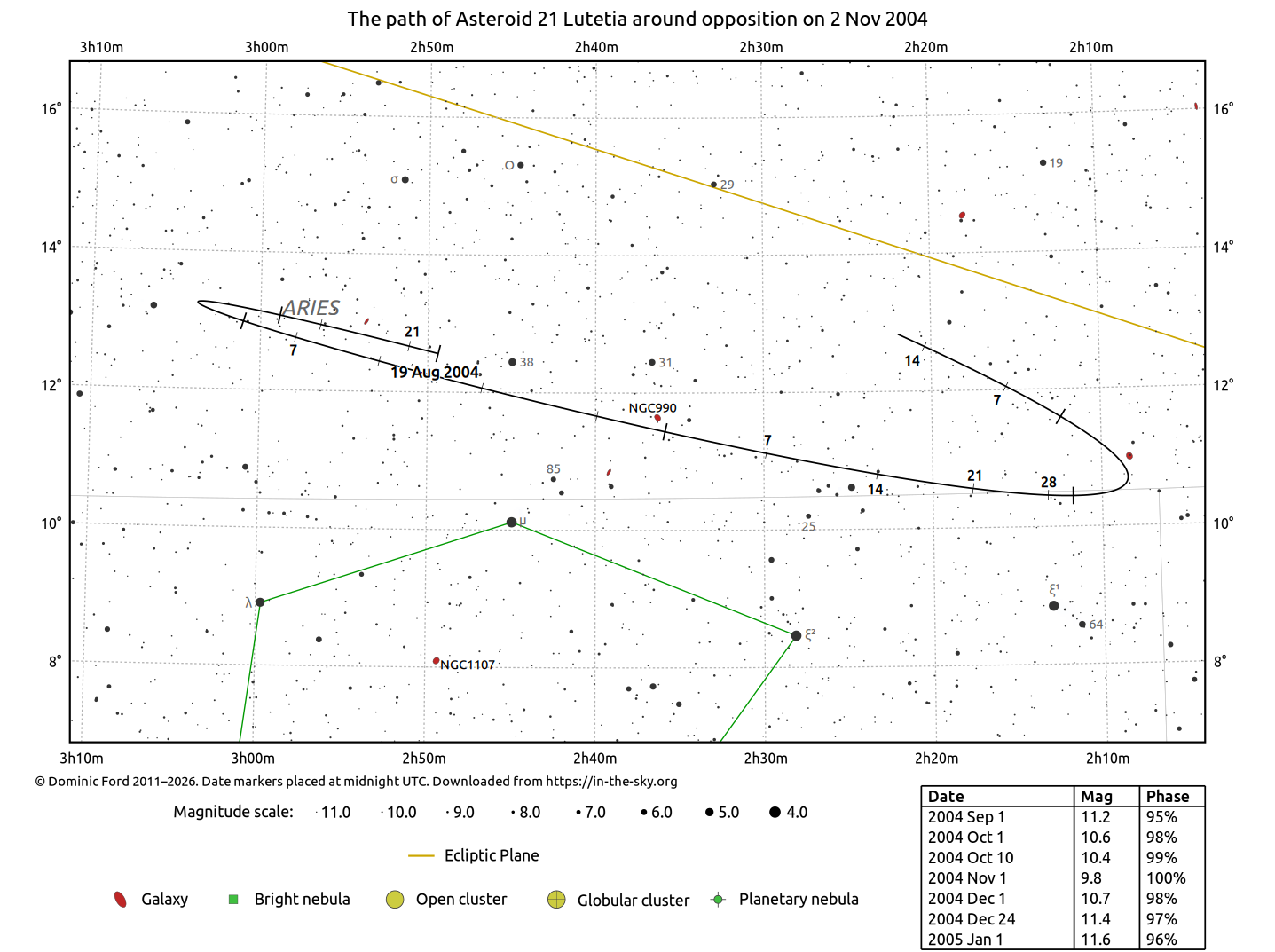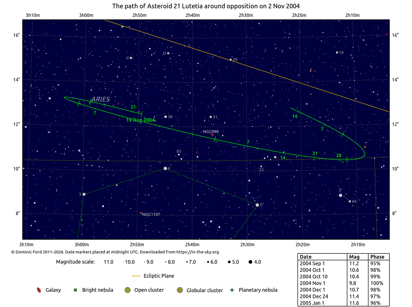 Asteroid 21 Lutetia 02h34m50s 11°22'N Aries 9.8