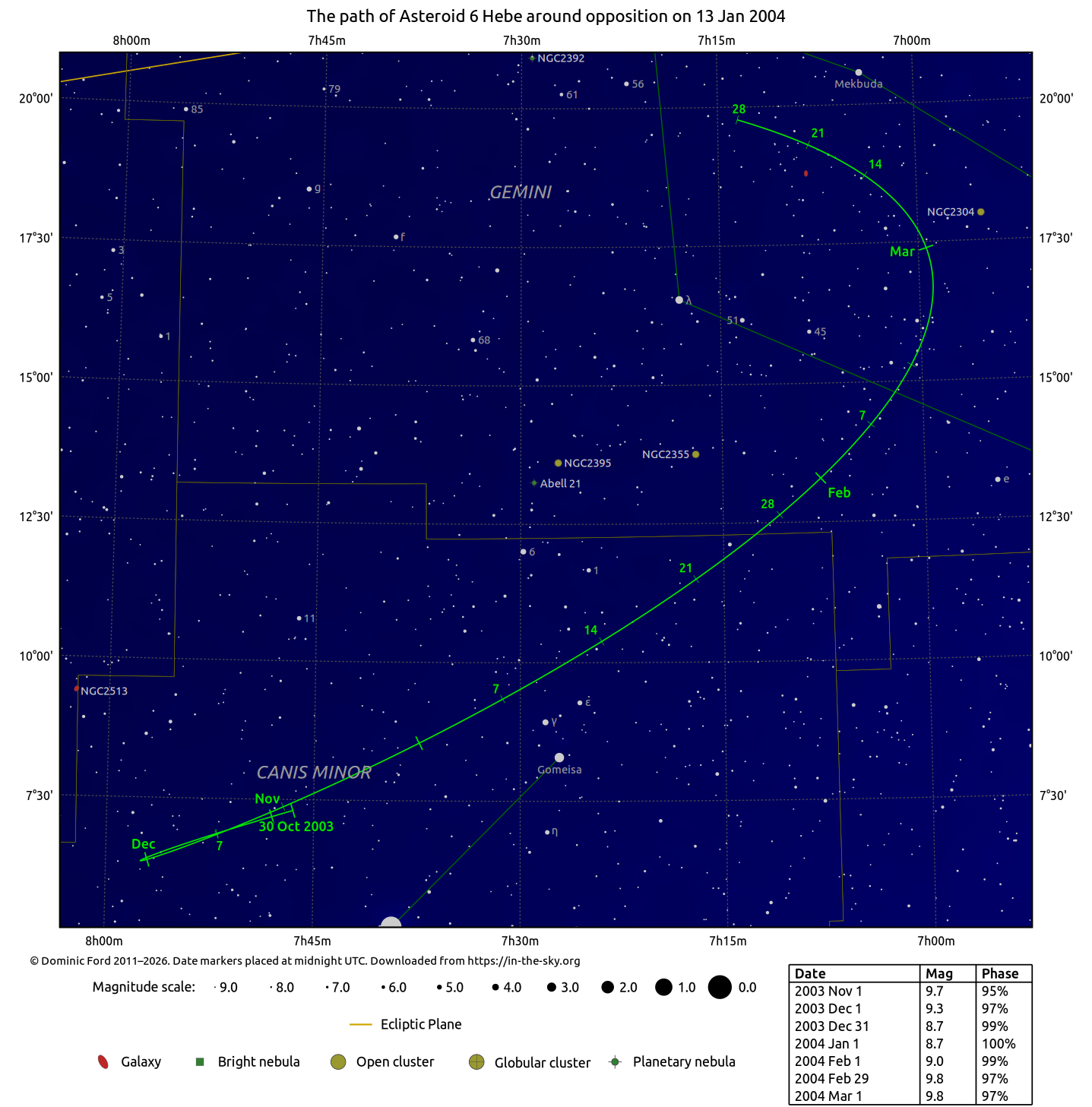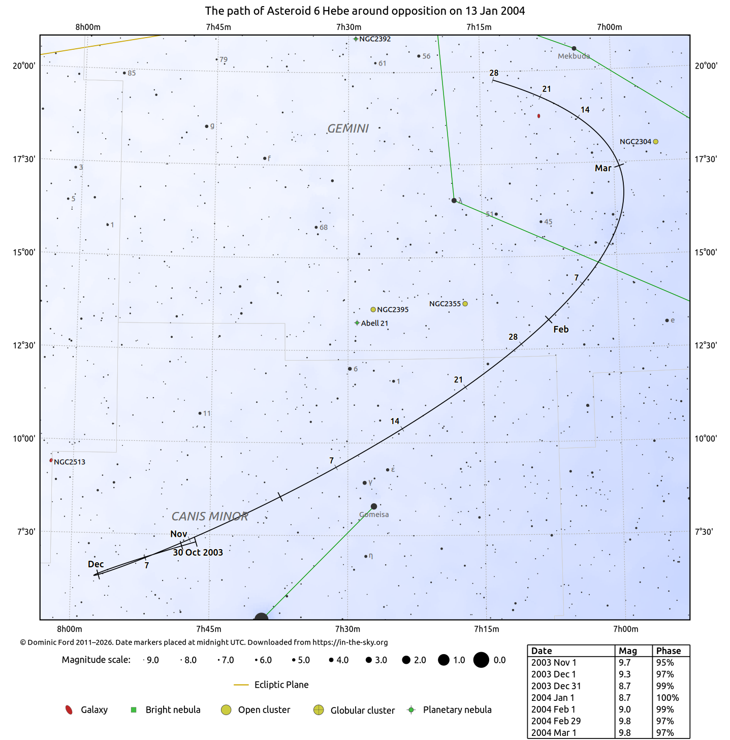 | Asteroid 6 Hebe | 07h25m00s | 10°14'N | Canis Minor | 8.6 |