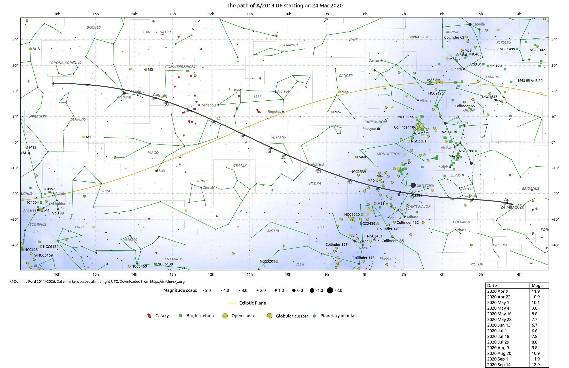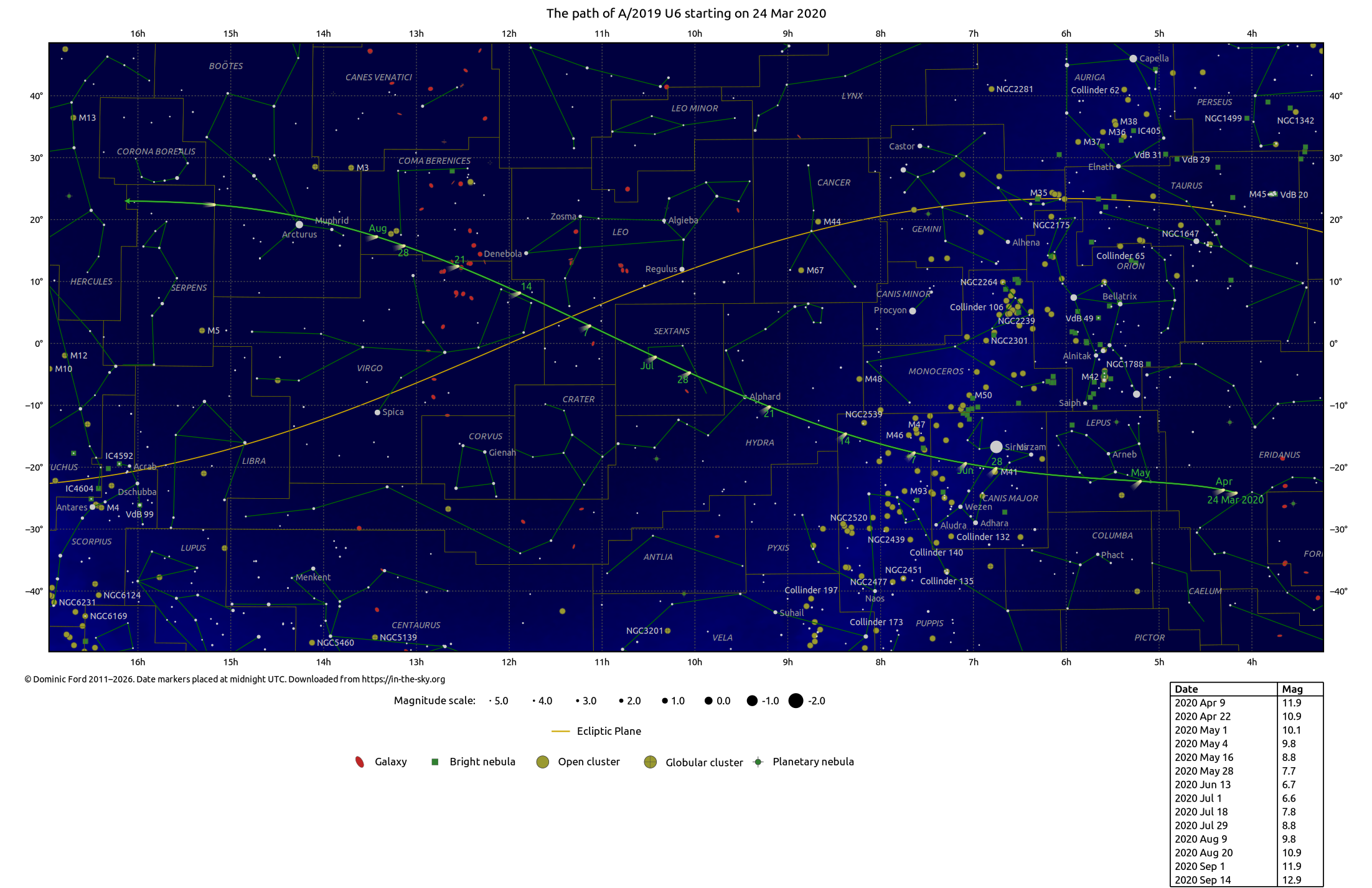 | Comet A/2019 U6 | 08h53m40s | 11°56'S | Hydra | 6.5 |