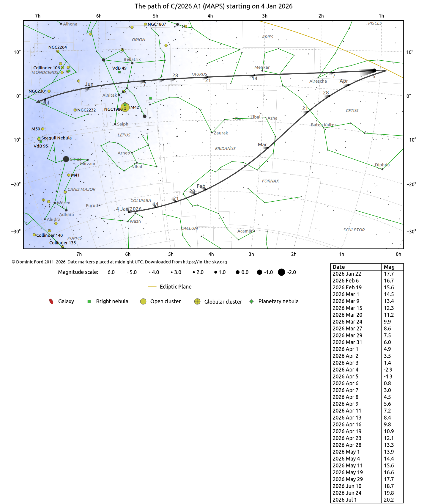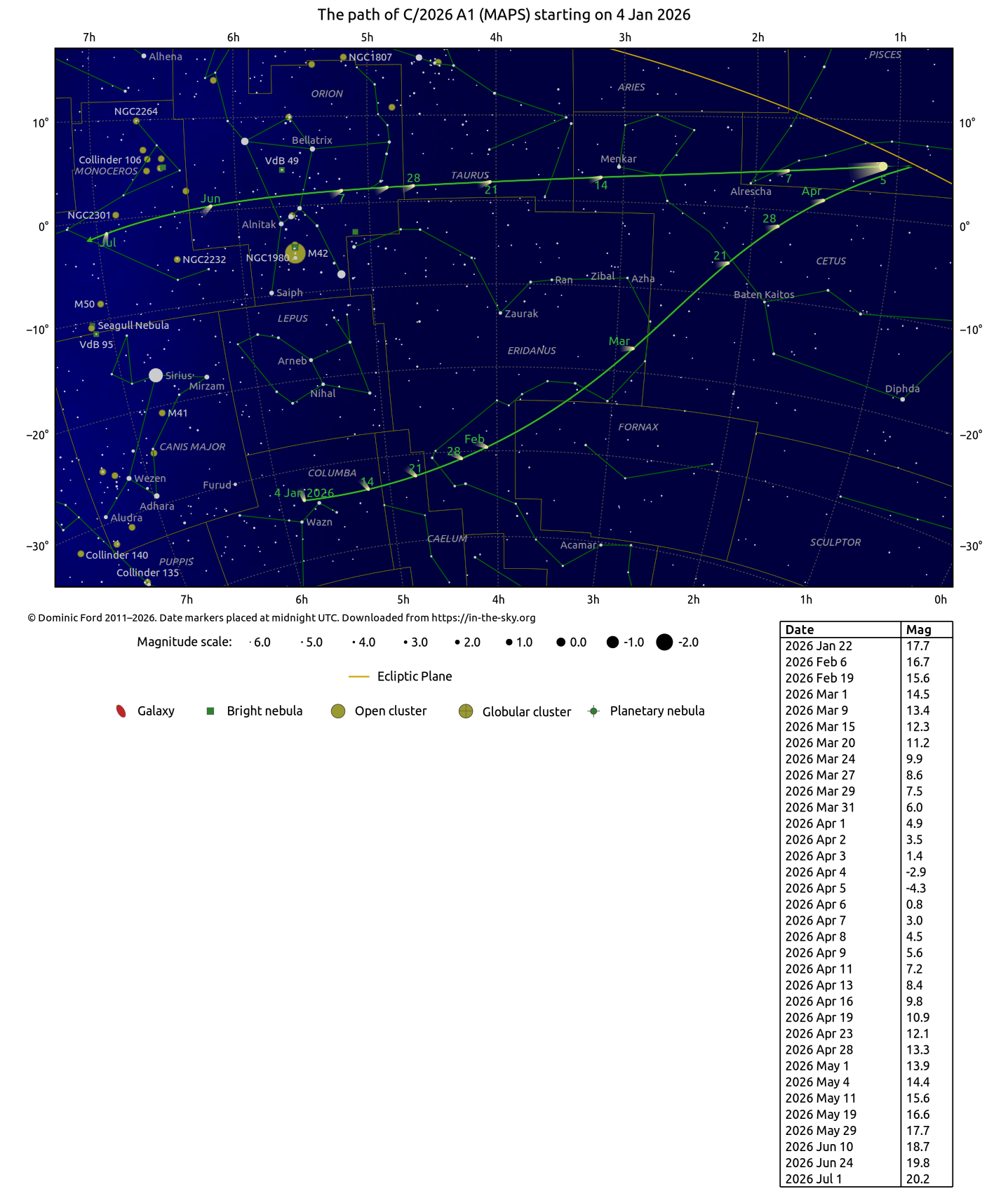 A more detailed table of C/2026 A1 (MAPS)'s position on each night is available here. A diagram of the orbit of C/2026 A1 (MAPS) is available here.